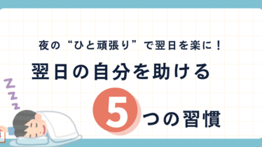 暮らしの工夫・育児の話 夜の”ひと頑張り”で翌日が楽に!翌日の自分を助ける5つの習慣 夜の”ひと頑張り”で翌日の自分を楽にする習慣を紹介します。基本当たり前の事ですが、続ける事で生活を整える事も出来ます。朝が苦手という方は是非ご覧ください。 2025.10.02 暮らしの工夫・育児の話